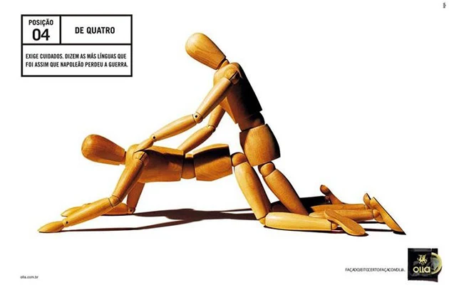 The Brazilian brand of condoms Olla advances the goods by means of wooden figures which shamelessly make love on advertising posters.